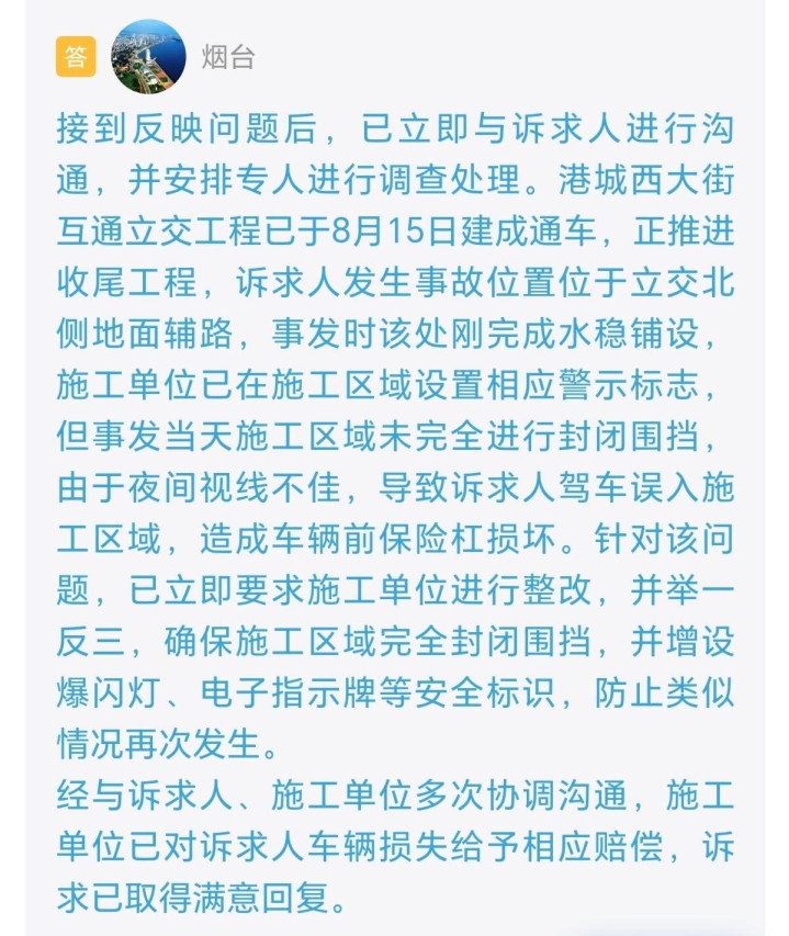 收到留言后,烟台市进行了办理并回复:诉求人发生事故位置位于立交北侧地面辅路。事发时该处刚完成水稳铺设,施工单位已在施工区域设置相应警示标志,但事发当天施工区域未完全进行封闭围挡。由于夜间视线不佳,导致诉求人驾车误入施工区域,造成车辆前保险杠损坏。针对该问题,已立即要求施工单位进行整改,并举一反三,确保施工区域完全封闭围挡,并增设爆闪灯、电子指示牌等安全标识,防止类似情况再次发生。经与诉求人、施工单位多次协调沟通,施工单位已对诉求人车辆损失给予相应赔偿,诉求已取得满意回复。