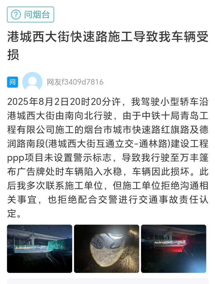 齐鲁网·闪电新闻10月2日讯烟台的一位网友在闪电新闻网络问政平台留言:2025年8月2日20时20分许杭州在线配资,他驾驶小型轿车沿港城西大街由南向北行驶。由于一施工现场未设置警示标志,行驶至万丰篷布广告牌处时导致车辆陷入水稳并损坏。此后他多次联系,但施工单位拒绝沟通相关事宜,也拒绝配合交警进行交通事故责任认定。