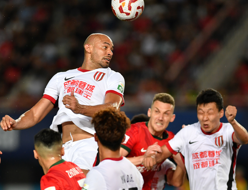 6月14日,成都蓉城队球员费利佩(上)在比赛中争抢头球。\n 当日,在河南郑州举行的2025赛季中国足球超级联赛第14轮比赛中,河南俱乐部酒祖杜康队主场3比2战胜成都蓉城队。\n 新华社记者 李嘉南 摄