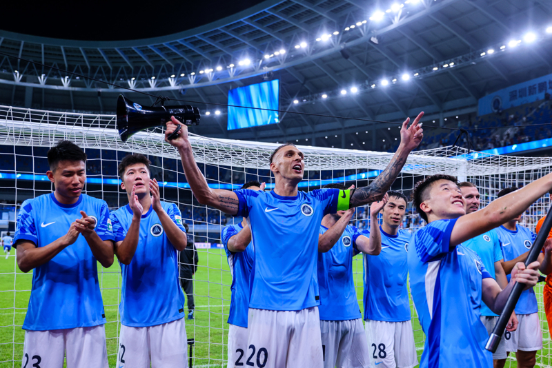 6月14日,深圳新鹏城队球员获胜后向球迷致意。\n 当日,在广东深圳举行的2025赛季中国足球协会超级联赛第14轮比赛中,深圳新鹏城队3比1战胜上海申花队。\n 新华社发(彭志刚摄)