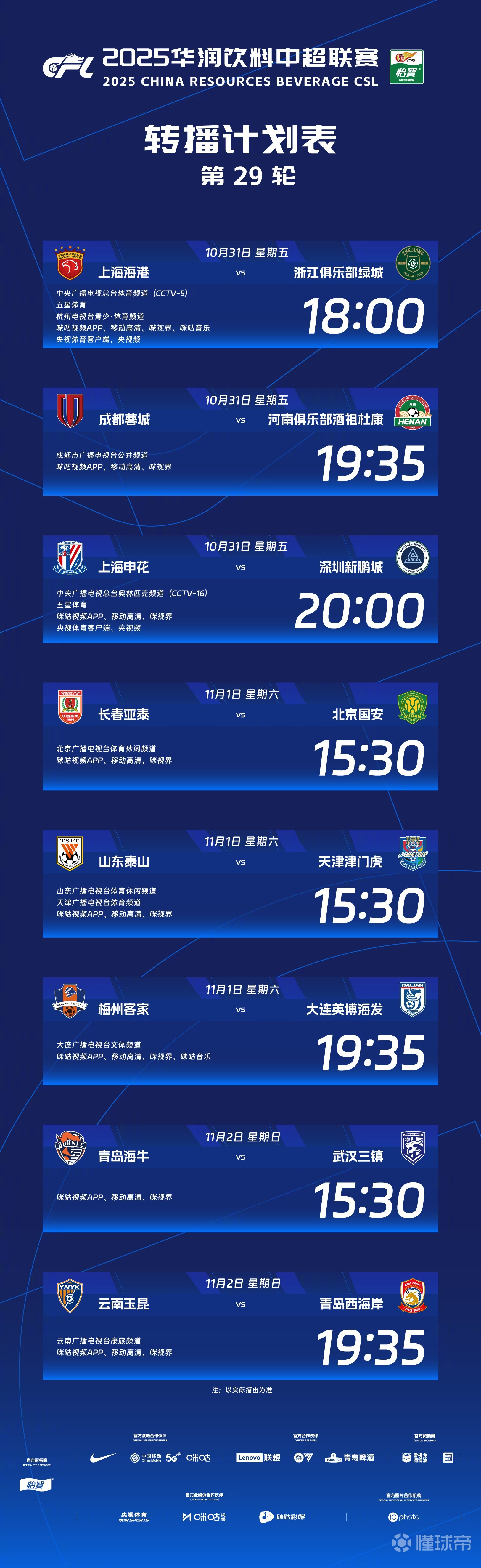 与上一轮相同,争冠的三支球队比赛安排在同一天进行,上海申花队将在主场迎来 “老冤家” 深圳新鹏城队。海港率先登场亮相,紧接着是成都蓉城和申花。具体赛程如下:10 月 31 日 18 点,海港于主场迎战浙江队;19 点 35 分,成都蓉城在主场对阵河南队;20 点,申花于主场迎来深圳新鹏城的挑战。